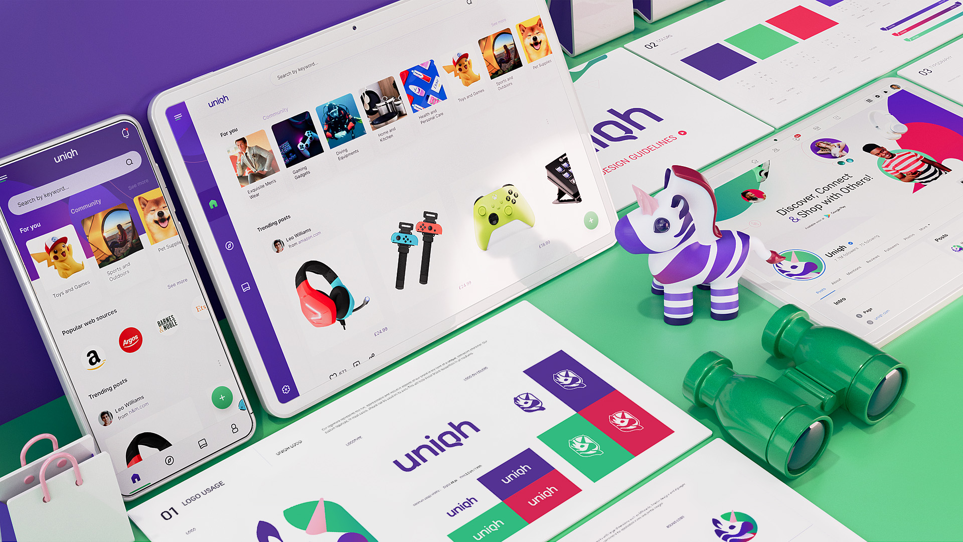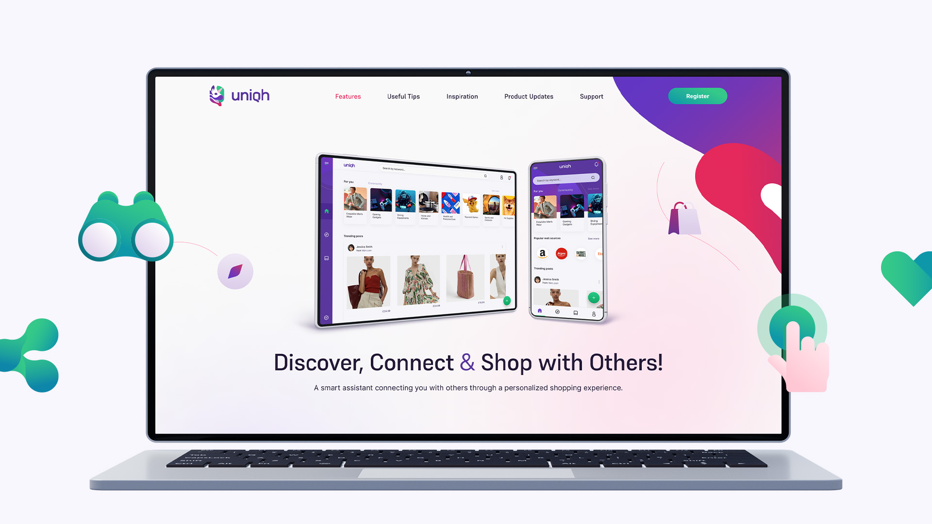 Brand identity, web and application design for a social shopping and discovery platform with smart features.